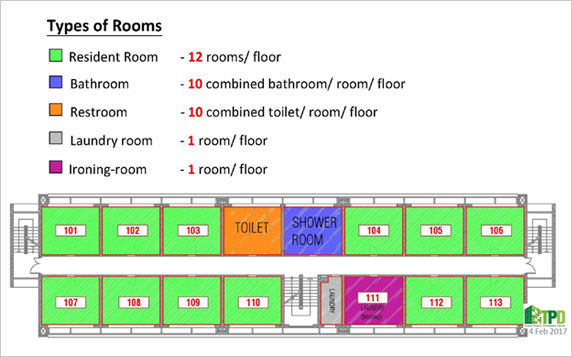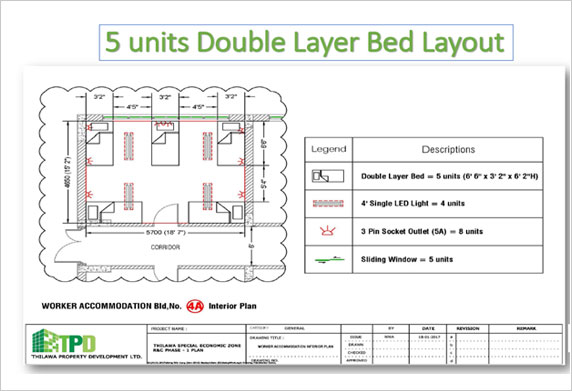 TPD had developed 3 Worker Accommodations intended to cater the need of people working in Thilawa SEZ. Each building consist of 5 stories and individual floor has 12 resident room, which make 60 resident rooms per building and total 180 rooms available for rent at reasonable rate on monthly basis.